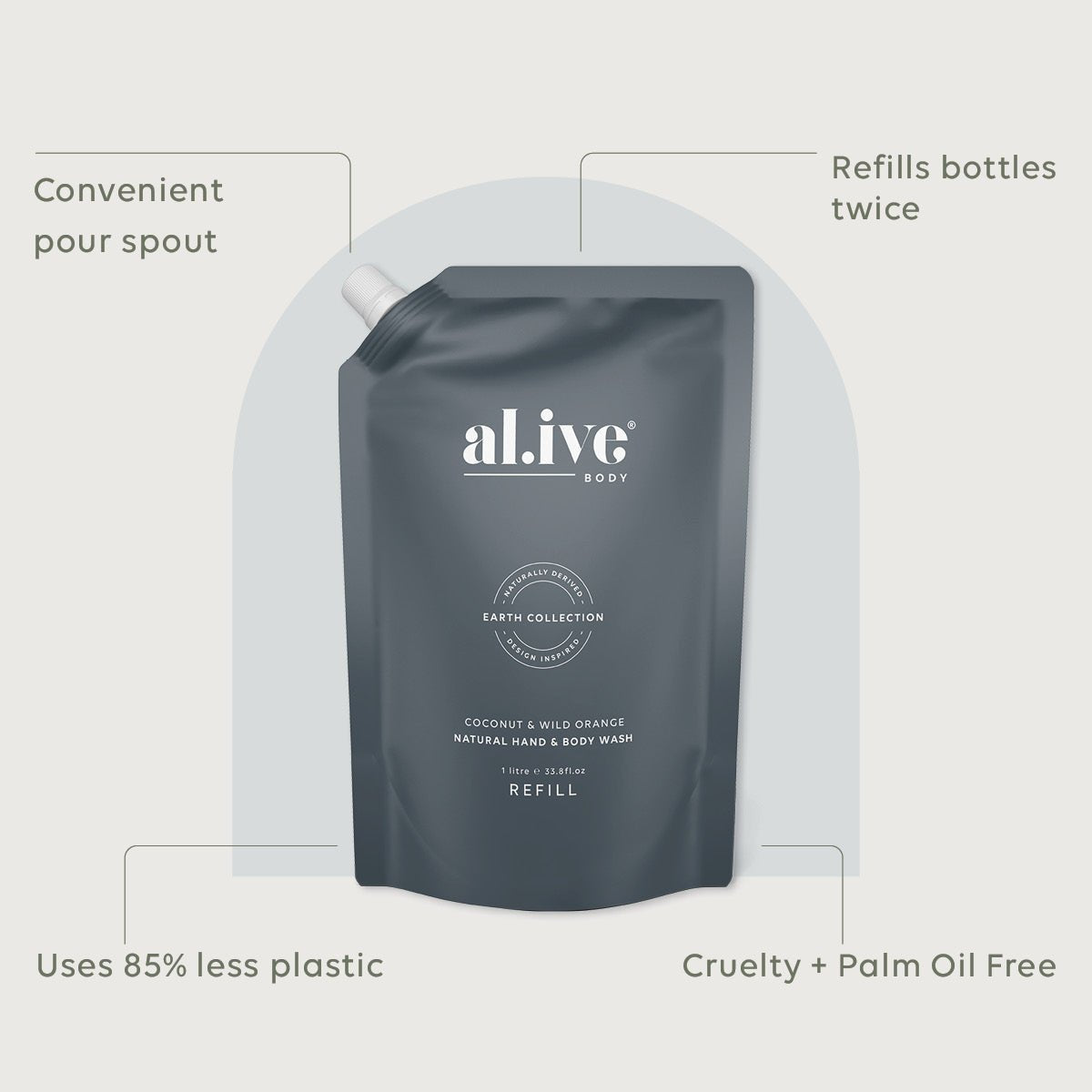 Our 1L refill pouches are designed to refill your existing al.ive body bottles whilst helping to reduce the amount of plastic used. Our refill pouches use 85% less plastic and refill your 500ml al.ive body bottle twice.