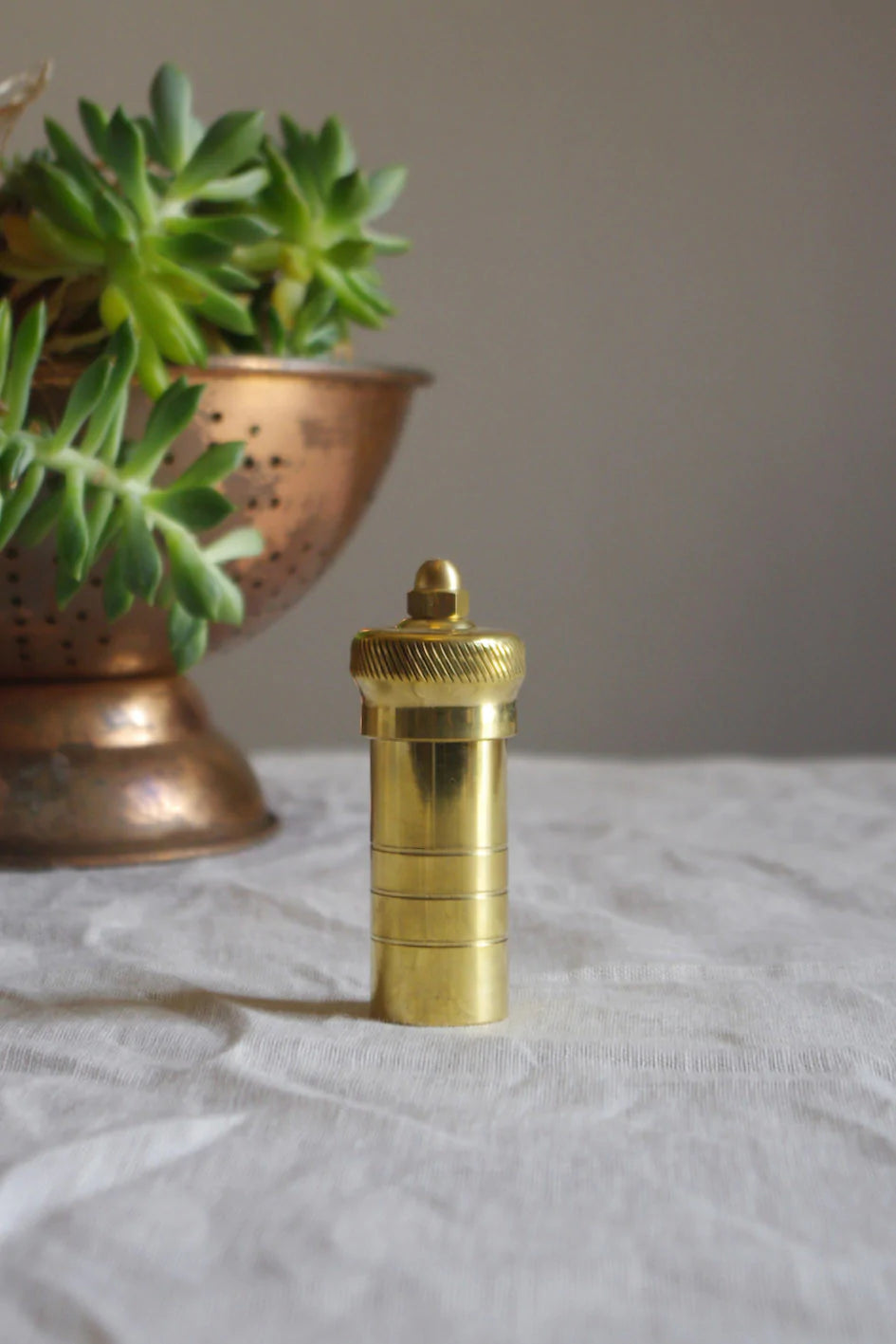 Manual opereated brass pepper mill with rotating top and open bottom
