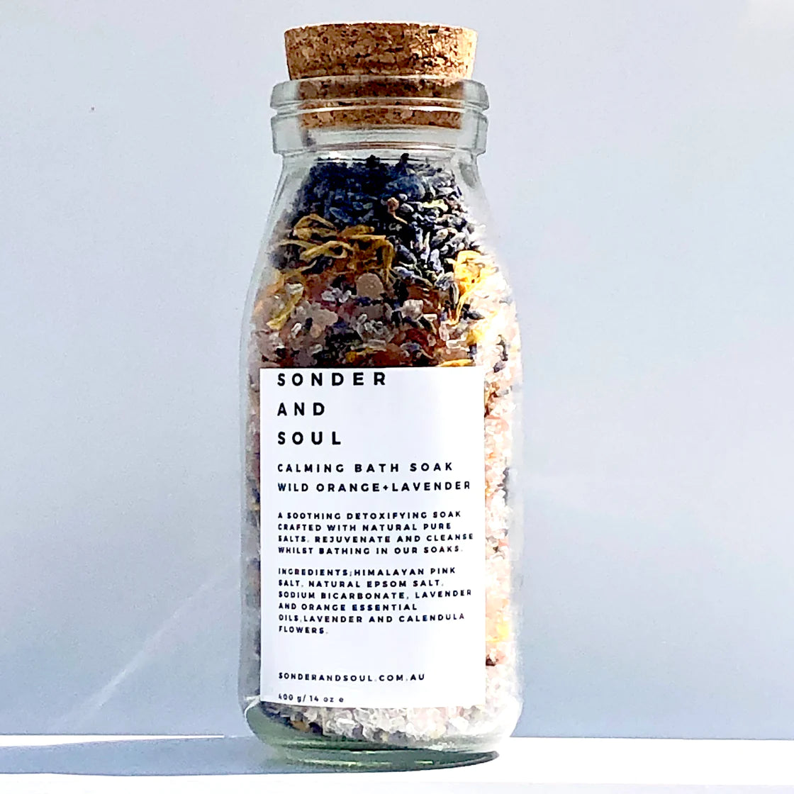 Lavender and Wild Orange Bath Soak 330g Ingredients | Himalayan Pink Salt, Certified Food Grade Natural Epsom Salt, Sodium Bicarbonate, Essential Oil Lavender and Orange, Organic Lavender Flowers Organic Calendula Petals