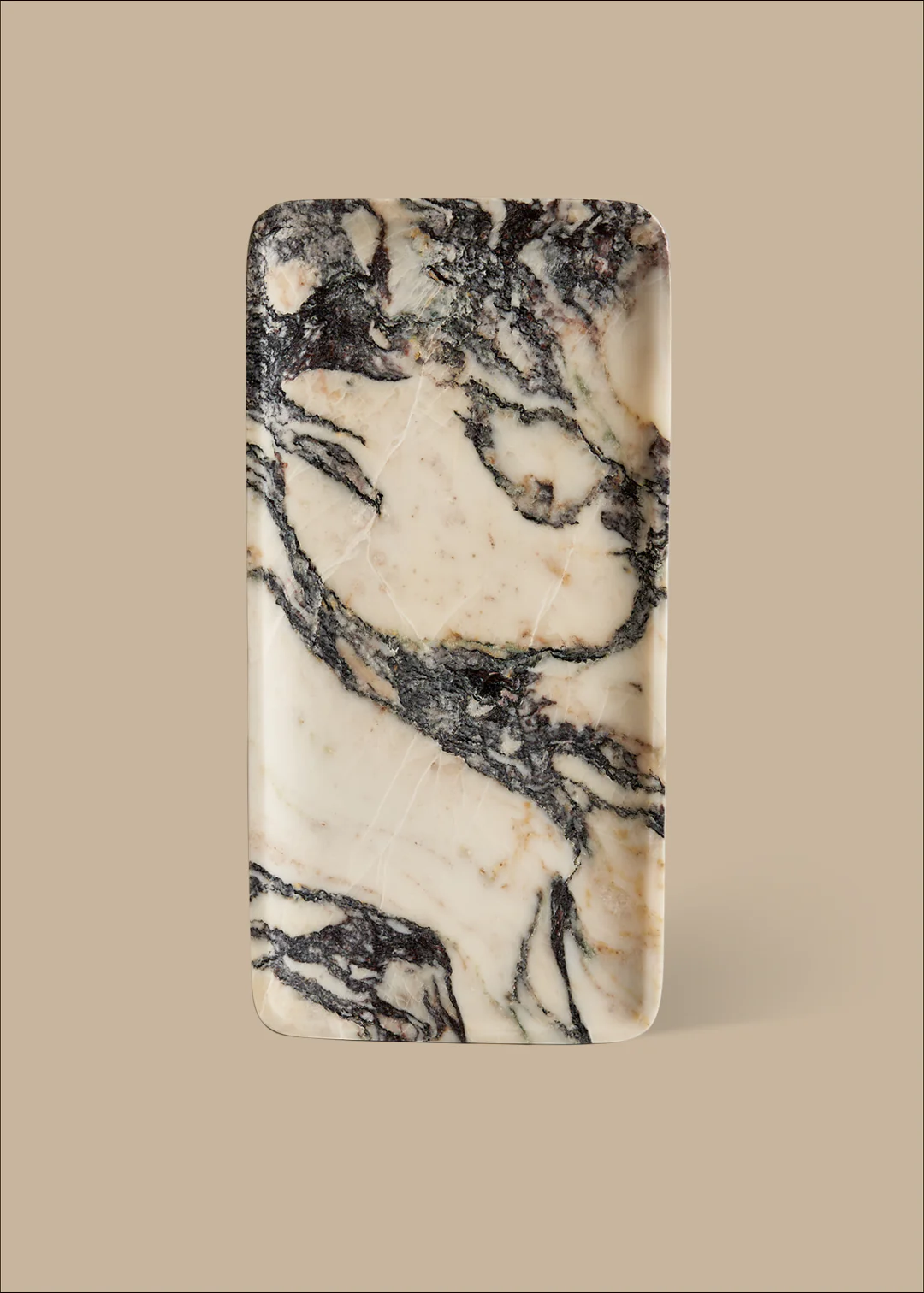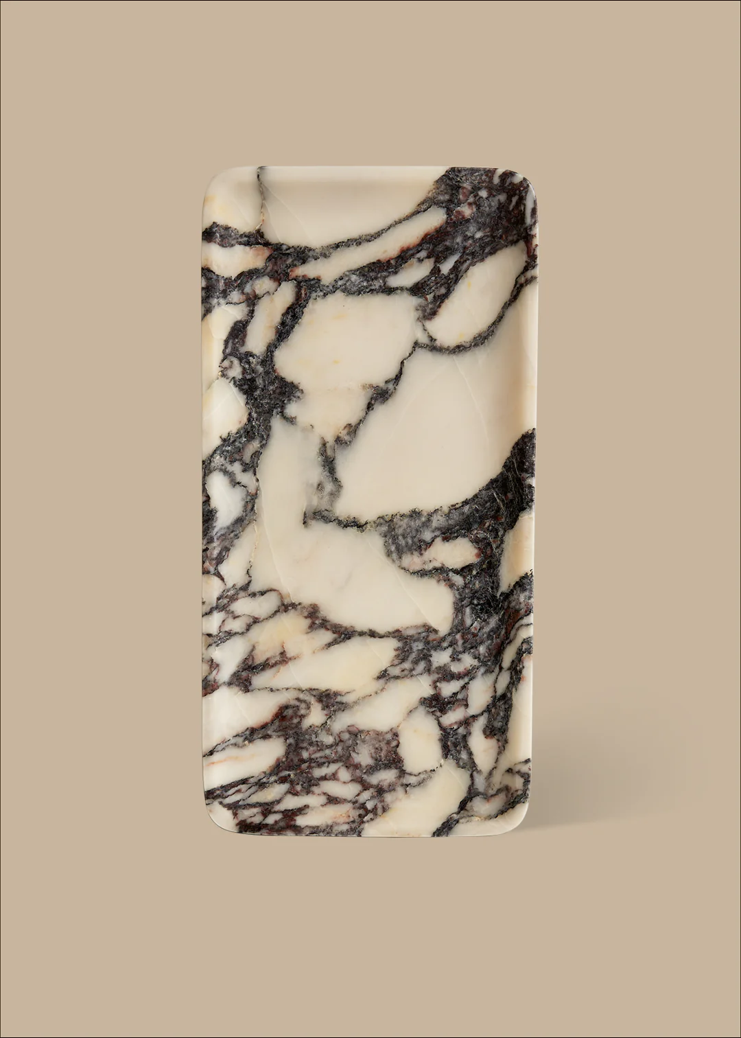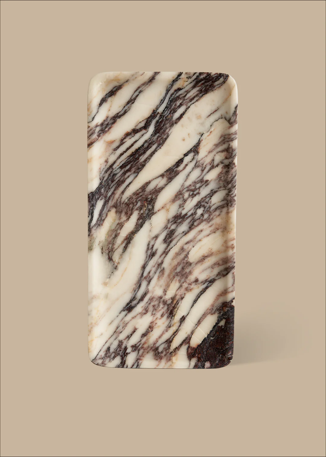Introducing the Linea Marble Tray, crafted from premium Calacatta Viola marble, renowned for its striking violet veins. The name 'Linea'—Italian for 'line'— reflects the design's essence, which features a graceful arc transitioning from the tray’s top edge to its base. This collection embodies a minimalist and organic style. The tray serves as an elegant organizer for candles, perfumes, jewelry, and more, enhancing the luxurious feel of any home decor.