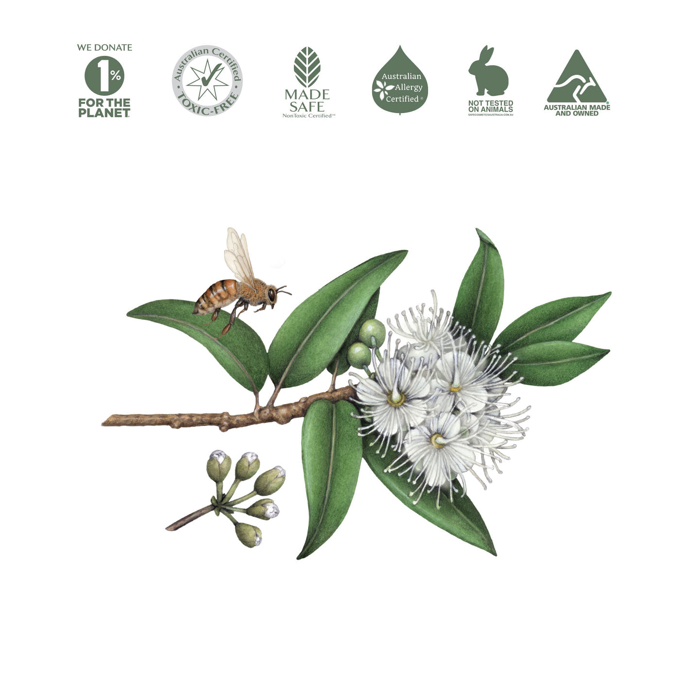Plant-Based Ingredients: Backhousia Citriodora (Lemon Myrtle essential oil) and Citrus Reticulata (Mandarin essential oil), Aqua (filtered water), Plant-based biodegradable surfactant, plant-based biodegradable solubiliser.